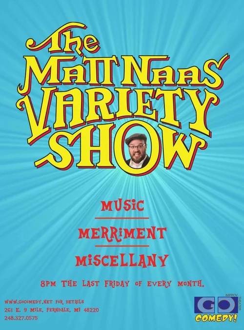 The Matt Naas Variety Show ($20) Thursday, December 29, 2016 8:00 PM 10:00 PM Google Calendar ICS PURCHASE TICKETS HEREMatt Naas hosts Go Comedy’s variety show, The Matt Naas Variety Show. Featuring live music from the Variety All-Star Band, surprise guests, and the best in local talent The Matt Naas Variety Show will bring you a new experience every month.