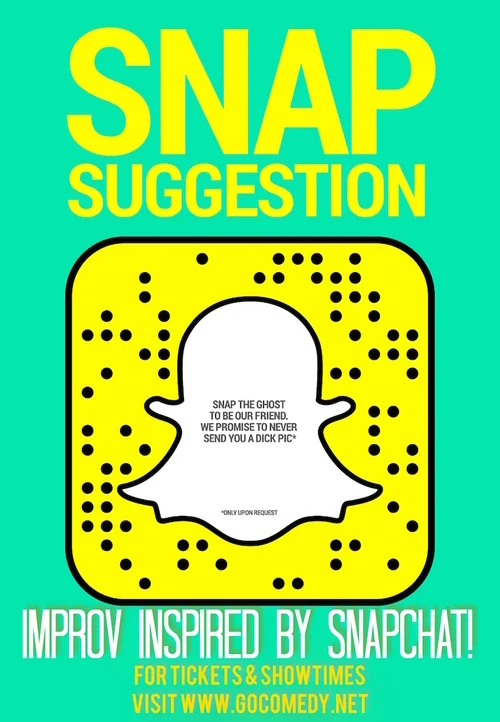 Snap Suggestion ($5) Wednesday, July 13, 2016 9:00 PM 10:00 PM Google Calendar ICS PURCHASE TICKETS HEREFrom the minds of Travis Pelto & Aaron Johnstone: an improv show where all the suggestions come from the world of Snapchat. Add “GoComedy” on Snapchat, send us an image or a video and your snap may be used to inspire a scene in the set.