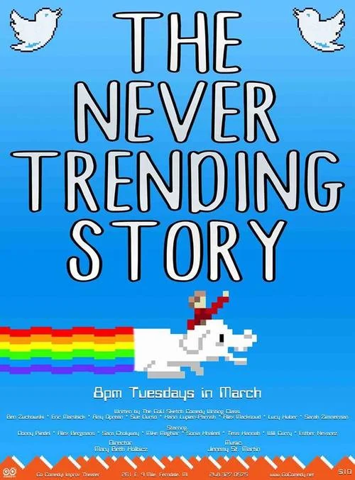Extra! Extra! Read all about it! The Never Trending Story hits Go Comedy! Improv Theater, Tuesdays in March! Has the recent onslaught of news and social media taken over your life? Well take it a step further! Join us as we take a comedic look at the news, media, technology, and much more in this sketch revue, written by students of the Go U! writing program.