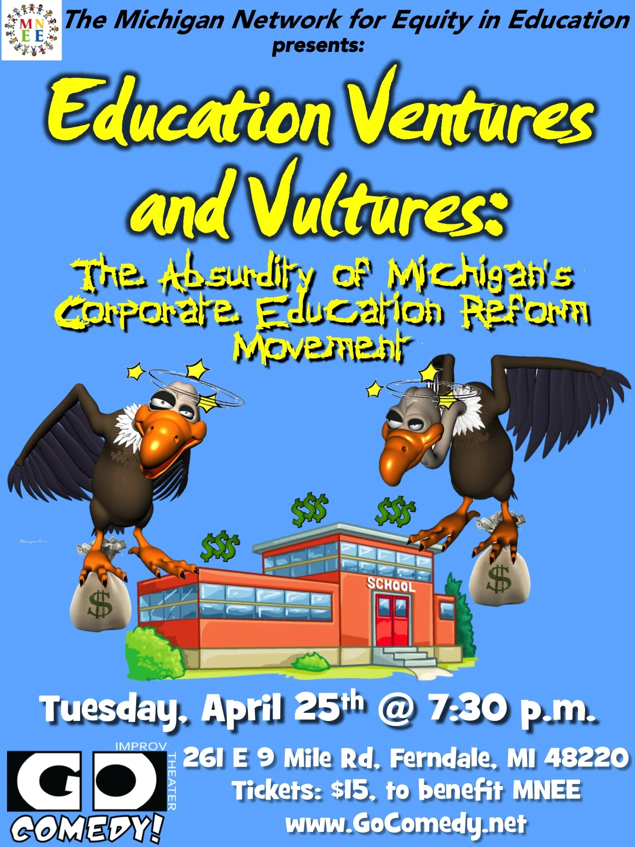A fundraising storytelling and comedy show on the topic of the Michigan corporate reform movement in education, benefiting the Michigan Network for Equity in Education.