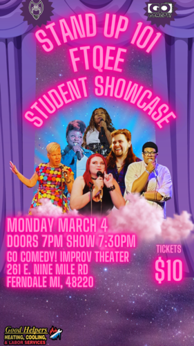 After six weeks of learning the foundations, building up confidence, and putting together materials, the Winter 2024 term of Stand Up 101 Femme, Them, and Queer Education Experience will be taking to the stage to perform!